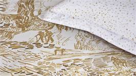 La housse de couette Champs de Semis de Beddinghouse rend hommage à Vincent van Gogh. Son imprimé original combine diverses peintures de la Provence rurale, en camaïeu d’ocre sur un fond clair. Côté dos, le motif abstract à effet coup de pinceau est inspiré du dessin à l’encre « Le Semeur ». Pour ajouter une touche de sophistication à l’ensemble, les taies d’oreiller assorties sont finies de volants plats tout autour.