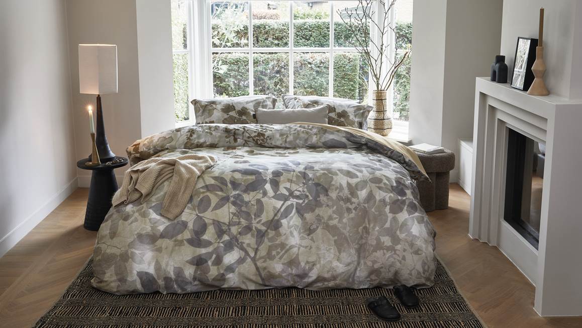 Inspirée par la nature, la housse de couette Hiroki de Beddinghouse apporte apaisement et fraîcheur. Les silhouettes de feuilles en camaïeu de couleurs neutres et naturelles s’immiscent parfaitement dans un intérieur de style slow life. La parure de lit réversible (taies d’oreiller comprises) a un dos uni beige.