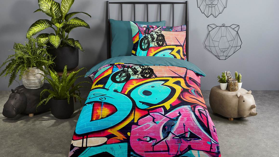 Ornée d’un imprimé à l’esprit Street Art, la housse de couette Charlie de Good Morning apporte une touche d’originalité à la chambre d’ado de style urbain. On aime les couleurs vibrantes de son motif graffiti. Finies d’un dos uni, la parure de lit et sa taie d’oreiller assortie (de 60x70 cm) permettent de relooker le lit en un tournemain.