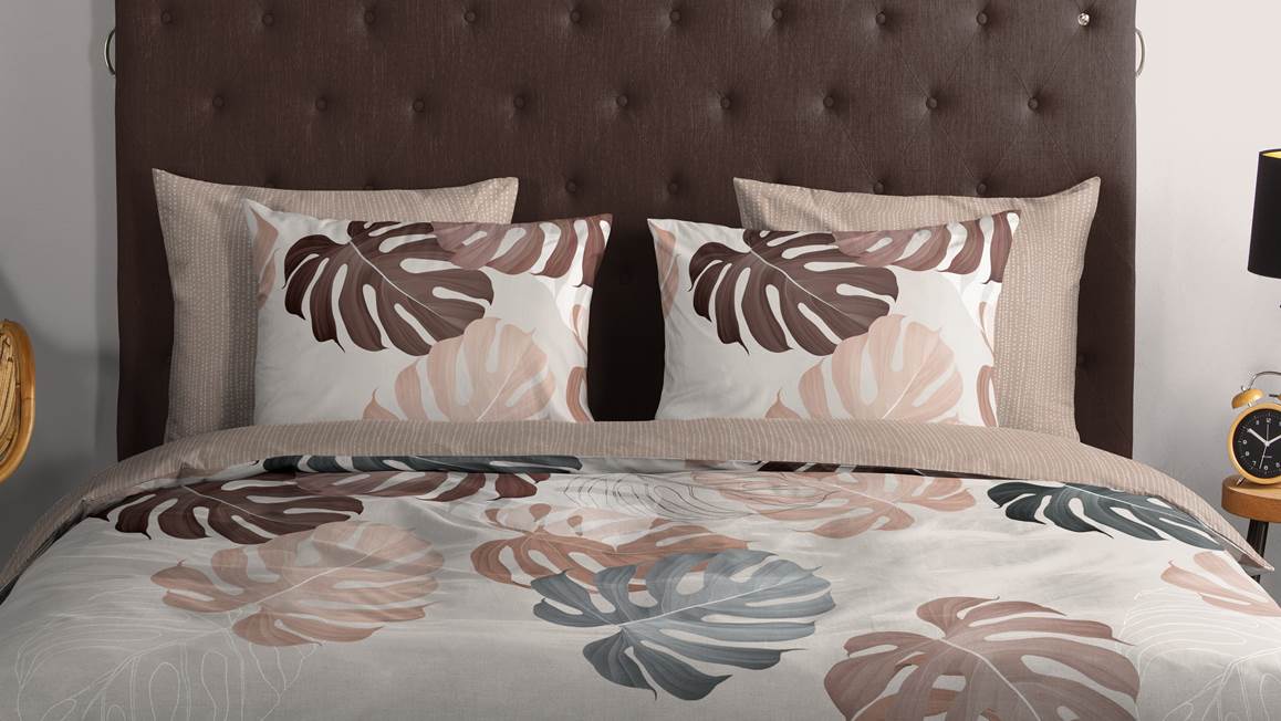 Les feuilles de monstera ajoutent un aspect tropical à la housse de couette Cianna de Good Morning. Ses teintes neutres et naturelles viennent apaiser la déco Urban Jungle, instaurant une atmosphère douce et reposante dans la chambre. Finie d’un dos uni de couleur sable, la parure de lit (qui comporte des taies d’oreiller assorties en 60x70 cm) permet de varier l’ambiance.