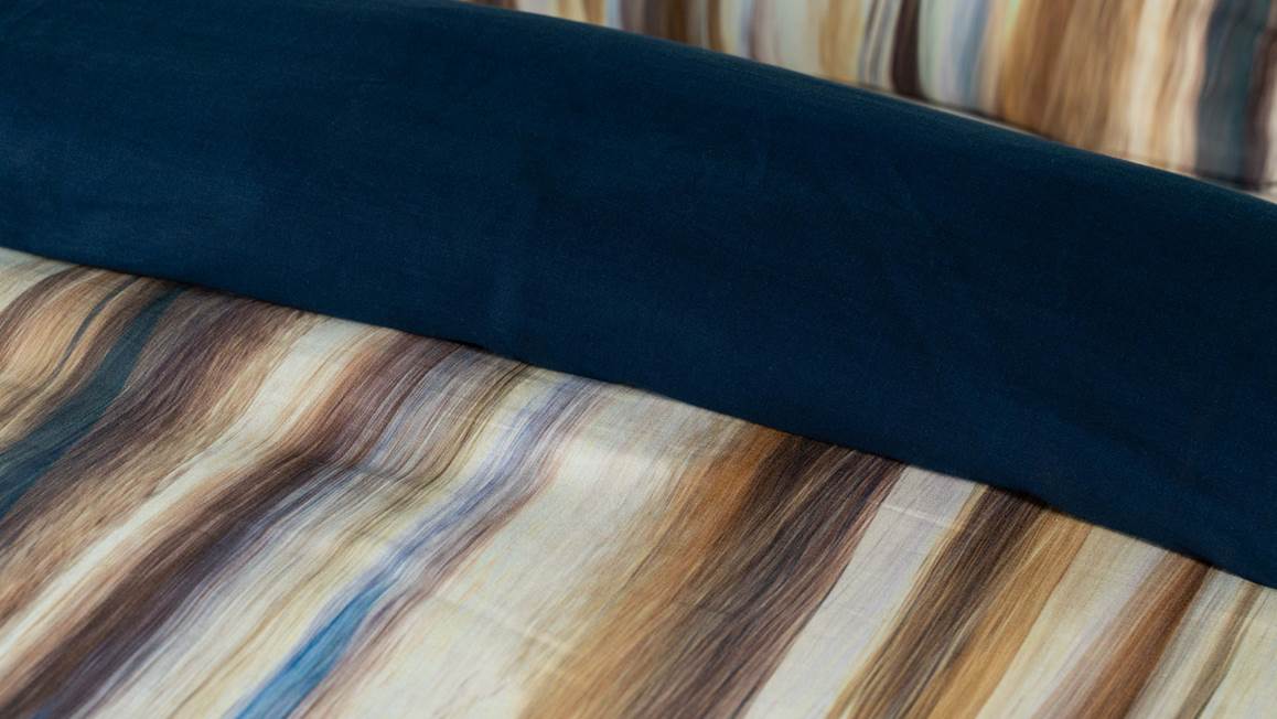 Grâce à son motif à rayures fluides, la housse de couette Atami de Kayori crée des jeux d’ombres et de lumière dans la chambre. L’accord du marron et du bleu lui confère une allure moderne et sophistiquée. Ornées d’un dos uni de couleur bleu nuit, cette housse de couette et ses taies d’oreiller assorties permettent changer facilement le look de votre lit.
