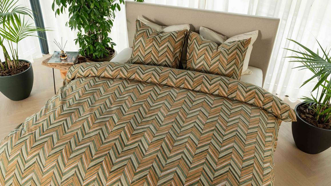 La housse de couette Dai de Kayori apporte une touche de raffinement à la déco d’une chambre zen. Son motif à chevrons associe différents tons de vert et d’orange pour transformer votre coin de nuit en un cocon de sérénité, relaxant et tendance à la fois. La housse de couette et ses taies d’oreillers coordonnées affichent le même motif graphiques sur les deux faces.