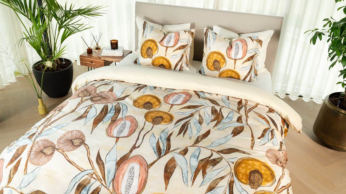 Avec son motif Nature à effet « coup de pinceau », la housse de couette Inako de Kayori confère un côté exotique à la déco. L’association de l’ocre au bleu clair fait rimer ethnique avec chic, créant une ambiance chaleureuse et cosy dans la chambre. Couette rabattue, le dos uni de couleur crème crée un contraste visuel saisissant qui vient accentuer le design contemporain.