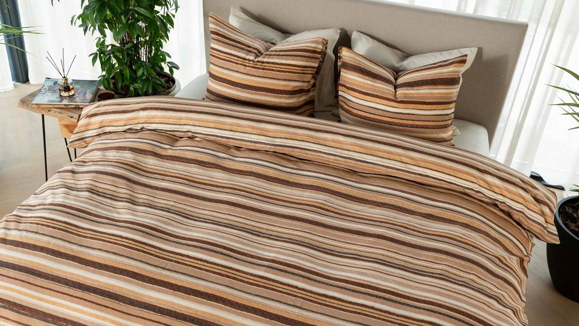La housse de couette Ito de Kayori se pare d’un motif à rayures en camaïeu de teintes terreuses. Les lignes irrégulières aux nuances naturelles accentuent son style chic et contemporain. Elles insufflent une ambiance apaisante et rassurante dans la chambre. Les taies d’oreiller assorties ont une taille standard de 60x70 cm.