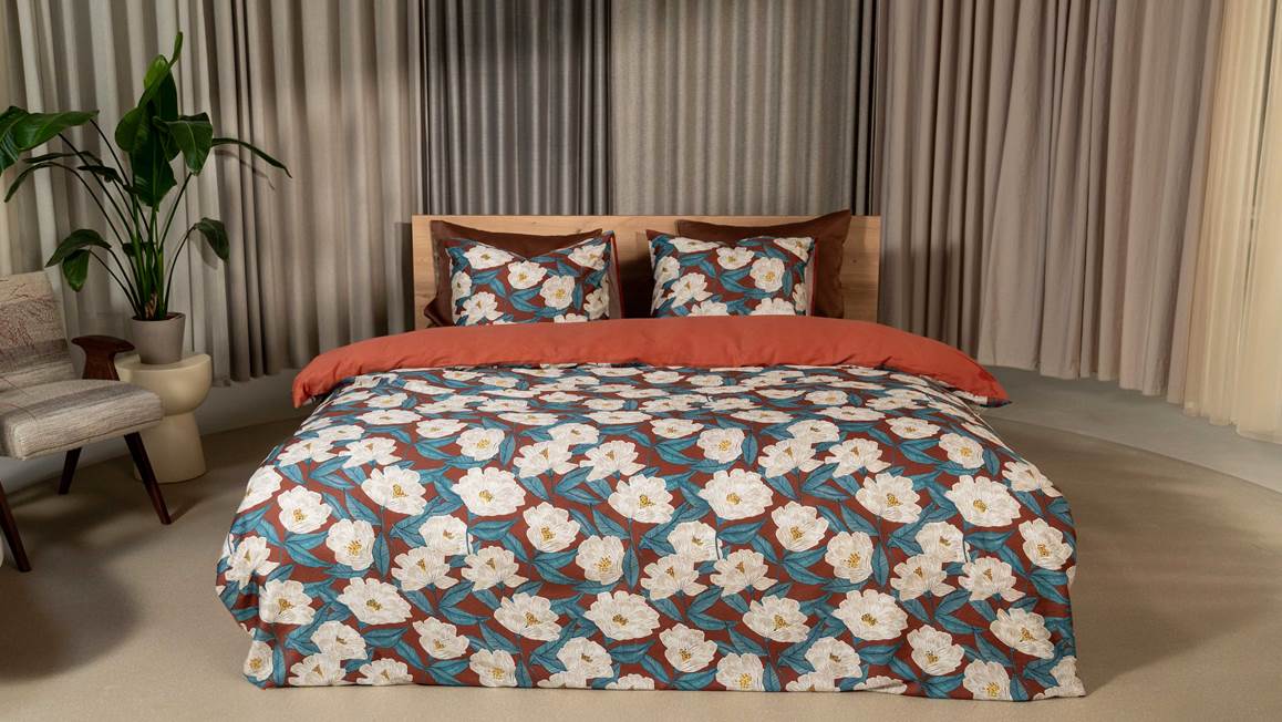 Esprit rétro chic pour la housse de couette Makoto de Kayori. Rehaussé d’un motif de vagues Seigaiha raffiné, son fond de couleur terracotta confère un côté ethnique au dessin floral en écru et bleu. La housse de couette réversible (dos uni) comprend les taies d’oreiller rectangulaires de 60x70 cm.