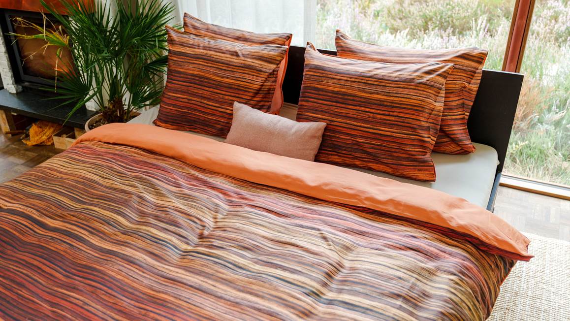 Pour une chambre harmonieuse et chaleureuse, on mise sur la housse de couette Mosa de Kayori. Inspirant élégance et nature, les teintes terreuses qui composent son motif à rayures horizontales ajoutent un charme rustique et intemporel à la déco. Pour trancher l’ensemble, la housse de couette et les taies d’oreiller assorties sont finies d’un dos uni de couleur terre cuite.