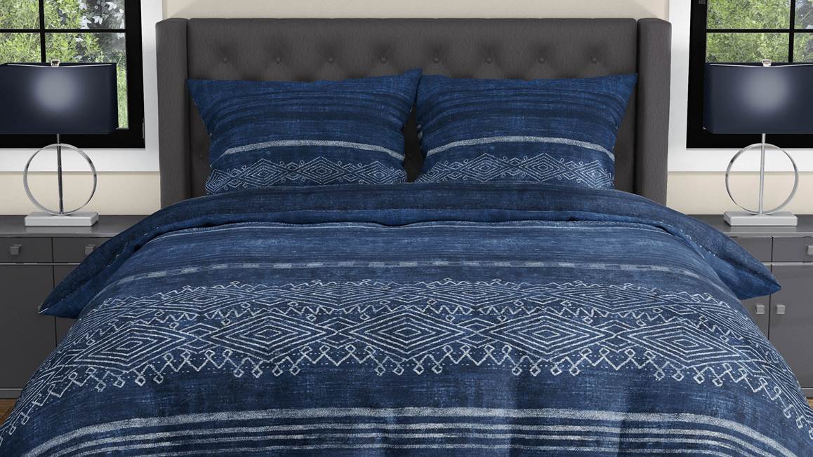 Créez une ambiance apaisante et douce dans votre chambre à coucher, grâce à la housse de couette Indy de Romanette ! Ses rayures à effet délavé en camaïeu de bleus se parent de motifs géométriques qui lui donnent un style masculin et contemporain. La housse de couette est vendue avec ses taies d’oreiller assorties.