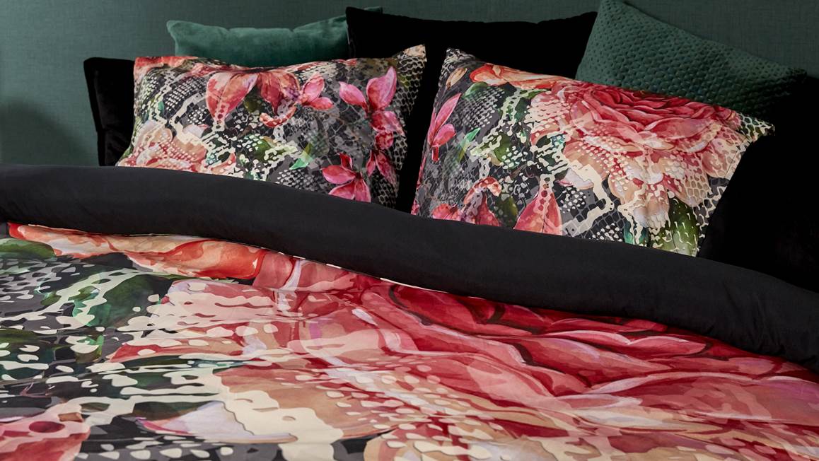 La housse de couette Snakeflower de Senzai se pare de fleurs tropicales à effet python. Côté devant, ses couleurs vibrantes viennent ponctuer son design tendance. Finie d’un dos uni noir, cette parure de lit résolument très actuelle ajoute une touche glamour à la décoration de la chambre. Elle comporte les taies d’oreiller assorties de 60x70 cm.