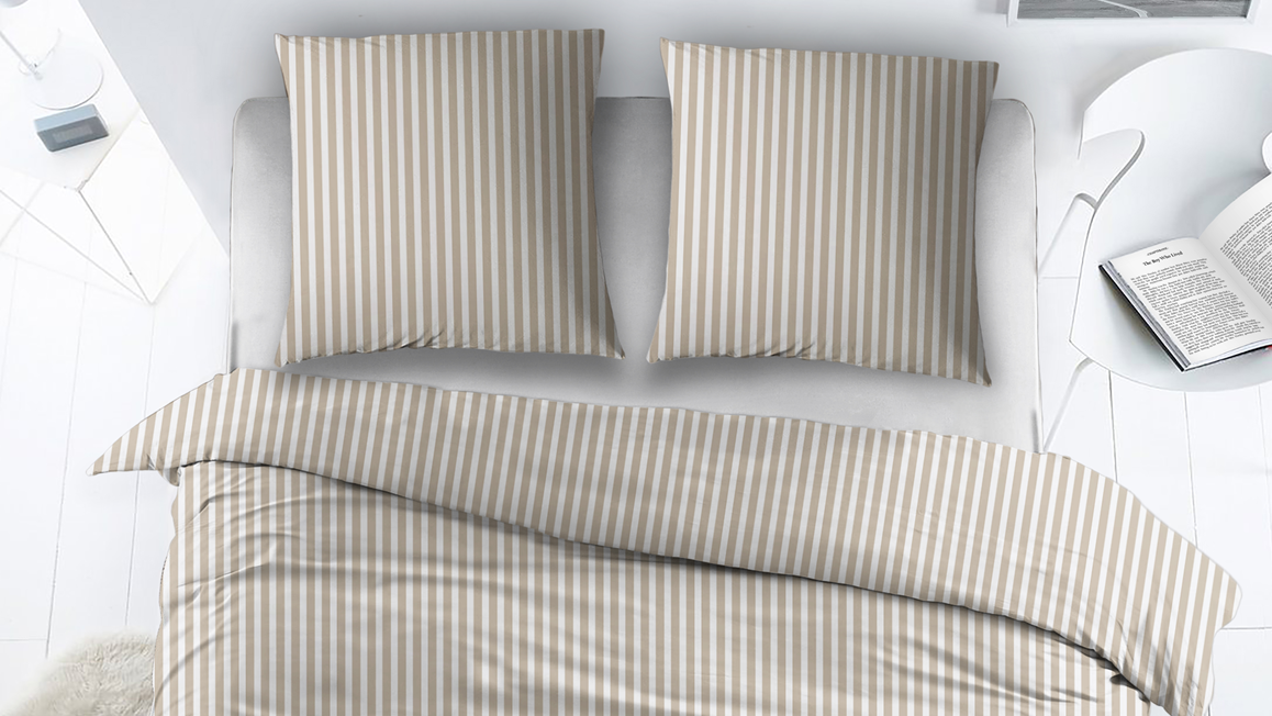 La housse de couette Carine de Snoozing apporte du relief à la déco de la chambre. Ses fines rayures en beige et blanc créent instantanément un rendu élégant et une ambiance paisible et sereine. Les taies d’oreiller assorties (comprises dans la parure de lit) ont un format carré de 65x65 cm.