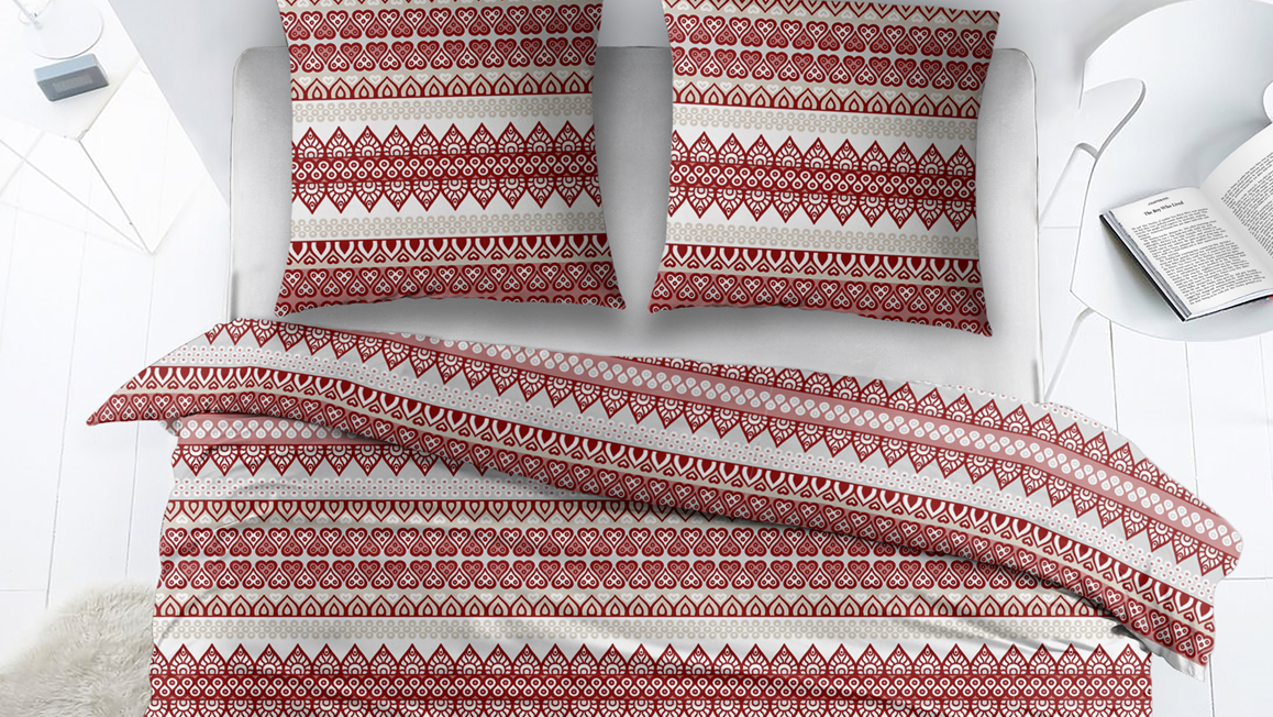 La housse de couette Kristel de Snoozing capture l’essence du style scandinave. Son motif géométrique en bordeaux et blanc crée un point focal captivant dans la chambre, instaurant une ambiance relaxante et cosy. La parure de lit comporte les taies d’oreiller carrée de 65x65 cm.