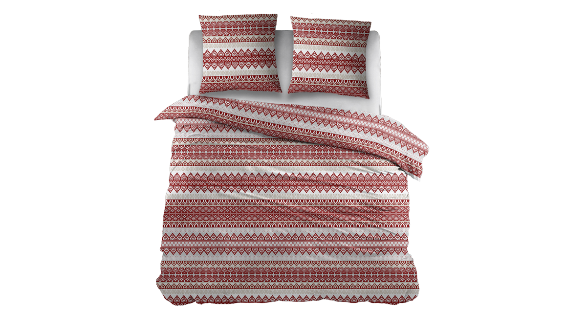 La housse de couette Kristel de Snoozing capture l’essence du style scandinave. Son motif géométrique en bordeaux et blanc crée un point focal captivant dans la chambre, instaurant une ambiance relaxante et cosy. La parure de lit comporte les taies d’oreiller carrée de 65x65 cm.