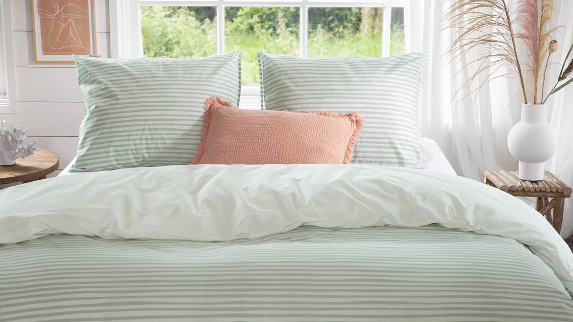 Pour une déco pleine de fraîcheur, adoptez la housse de couette Rayures Fantaisie de la collection Recyclé de Walra au coloris Jade ! Son motif à rayures irrégulières en différents tons de vert est fini d’une large bande blanche au niveau de la partie supérieure. Selon la taille commandée, une ou deux taies d’oreiller assorties sont comprises dans la parure de lit.